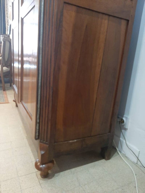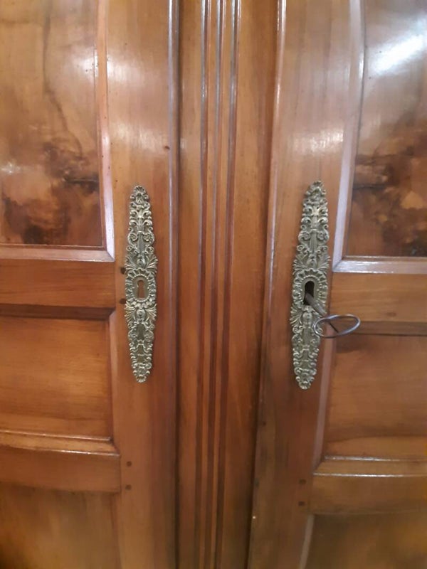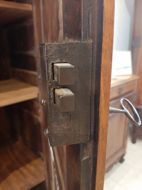 Elle ouvre en façade par deux vantaux moulurés offrant un intérieur composé de quatre étagères. La crémone et la serrure deux points en fer forgé fonctionnent parfaitement avec la clé d'origine.