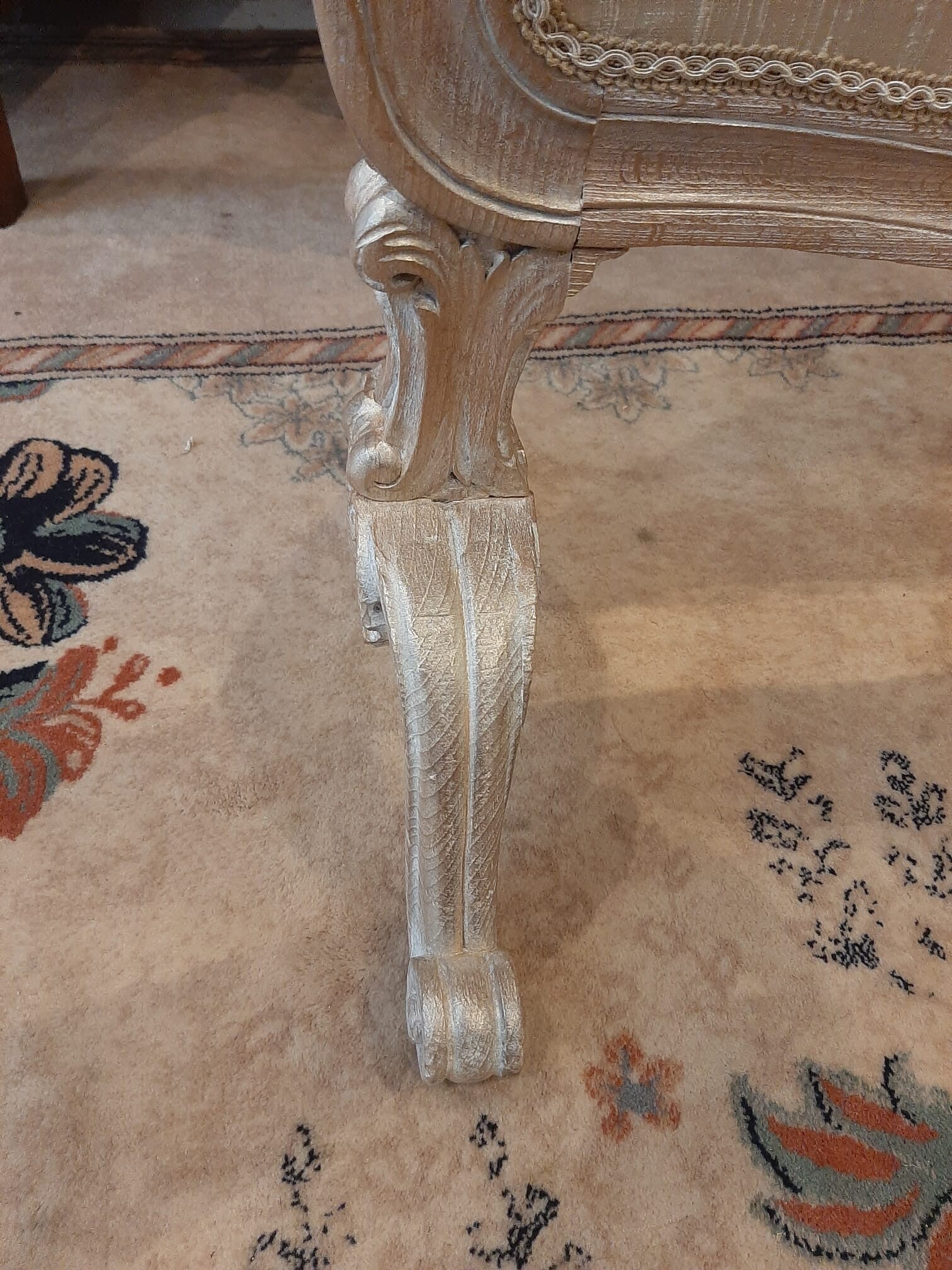 Panel set in an animated frame, dressed in wild silk, resting on four feet ending in scrolls.