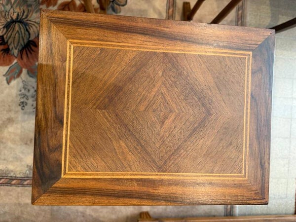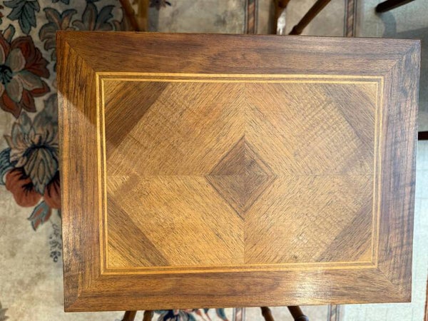 Estas mesas combinan elegancia y funcionalidad, con refinados patrones de marquetería que demuestran la artesanía de la época.
