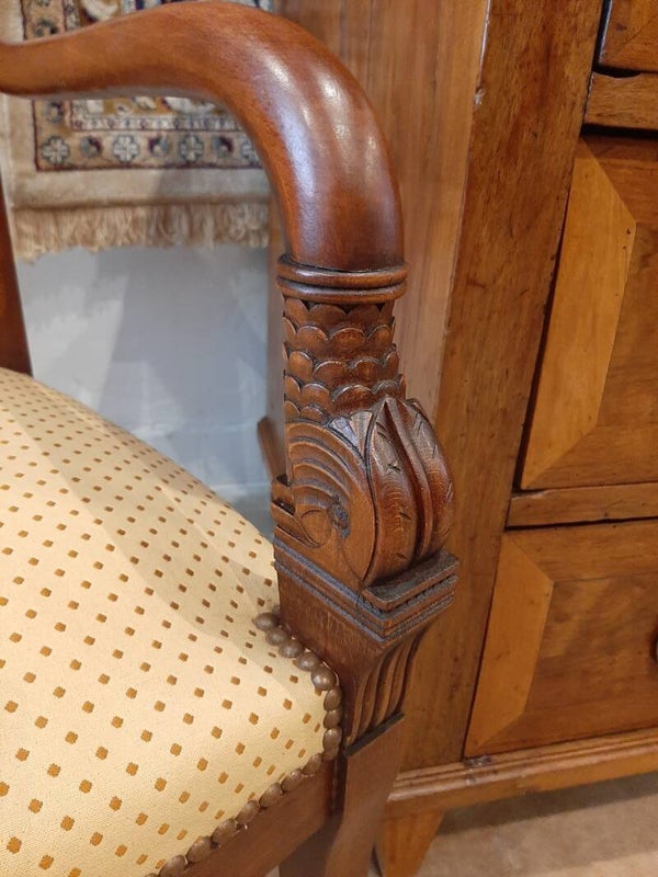 These armchairs rest on saber legs. The connecting stops feature a dolphin head decoration on either side, forming armrest consoles. The crooked arms are remarkably finished and elegant, full-bodied, well-rounded, and exquisitely tapered, ending in a tail that joins the backrest upright, adorned with stylized scales.