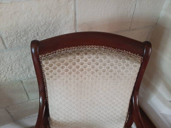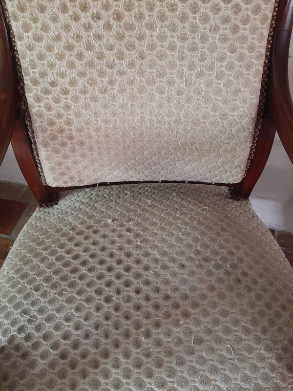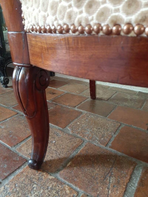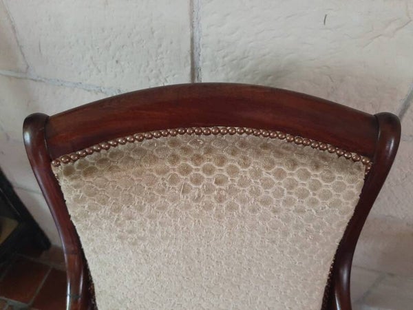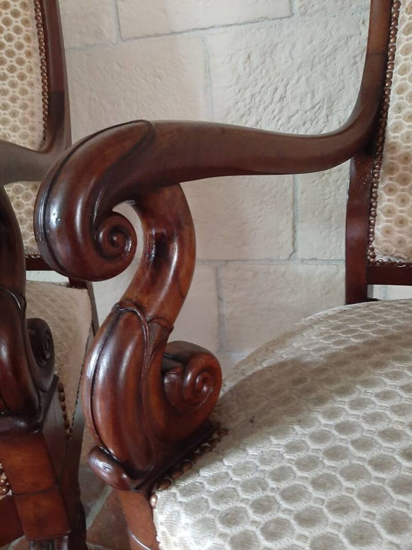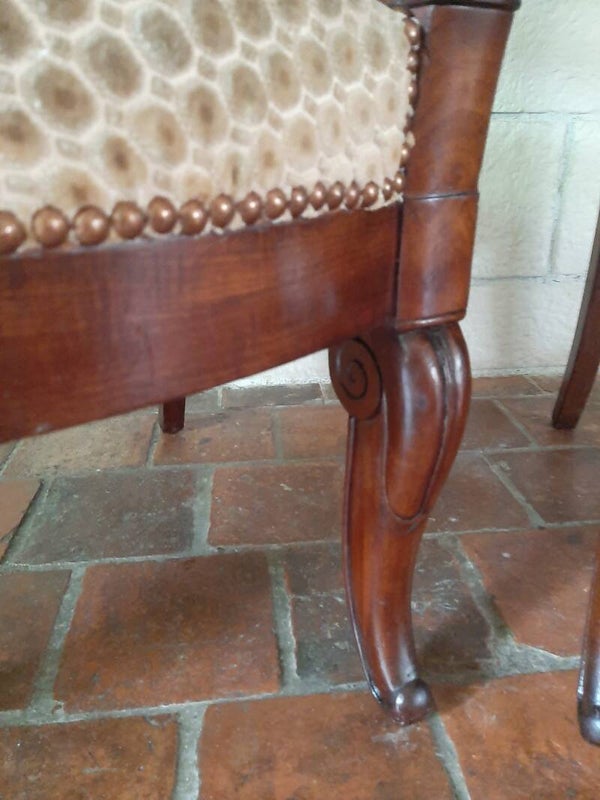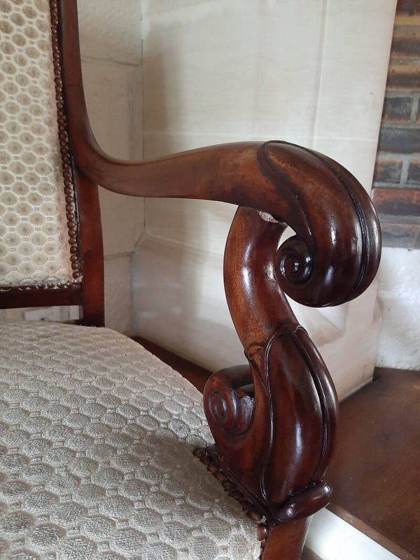 These mahogany and mahogany veneer armchairs from the Restoration period (1815-1830) are interesting for their historical value and their craftsmanship, which reflect the aesthetics of their time. They will impress with their size, particularly the height of the seat. The cross-shaped armrests rest on generously carved scrolled consoles that connect to the seat. The upper back is curved. They rest on a "frog leg" front base and a saber rear base. The front apron is slightly curved. The upholstery is adequate; the embossed velvet fabrics require updating but can be used in their current condition. Note: traces of restoration at the base of one armrest. Seat height 42 cm - Total height 95 cm - Width 63 cm - Depth 52 cm.