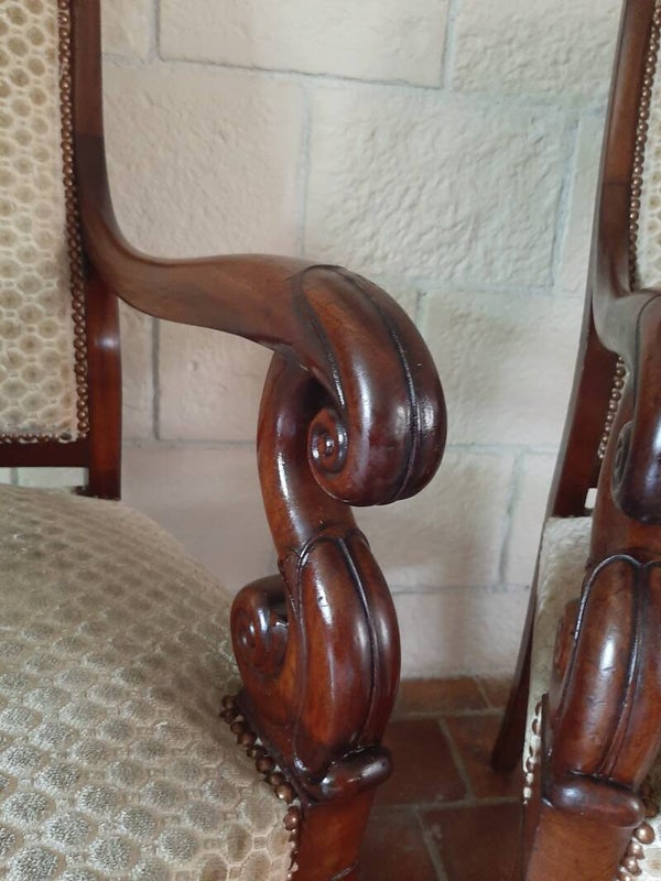 Queste poltrone in mogano e impiallacciatura di mogano, risalenti al periodo della Restaurazione (1815-1830), sono interessanti per il loro valore storico e per la loro fattura che riflette l'estetica del tempo. Vi sedurranno con le loro dimensioni, in particolare con l'altezza della seduta. I braccioli a croce poggiano su console generosamente tagliate e con volute che si collegano al sedile. Lo schienale superiore curvo. Poggiano su una base anteriore a "zampa di rana" e su una base posteriore a forma di sciabola. La cintura anteriore è leggermente aderente. Il rivestimento è corretto, i tessuti in velluto goffrato hanno bisogno di essere rinfrescati ma possono essere utilizzati così come sono. Si notino le tracce di restauro all'inizio di un bracciolo.