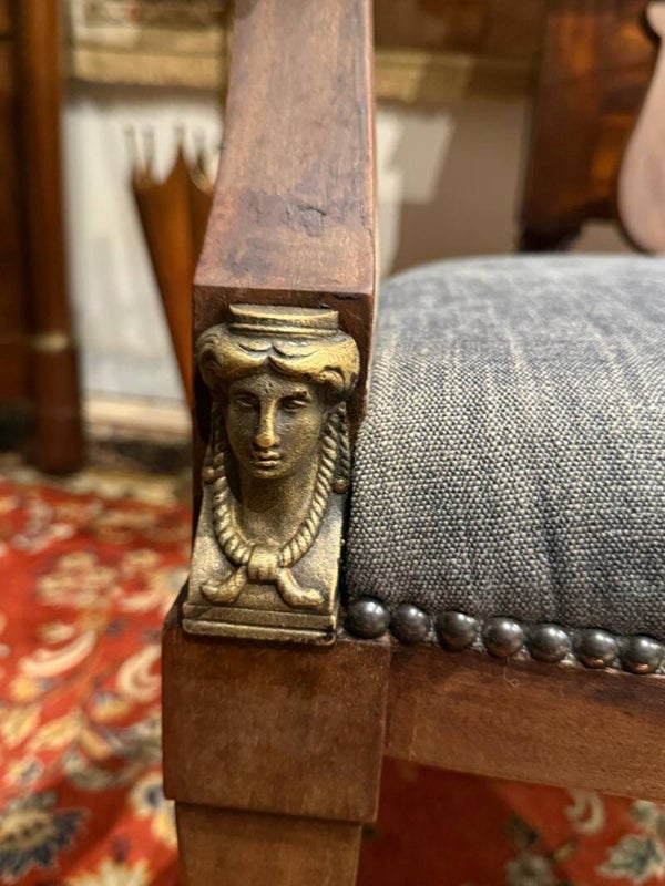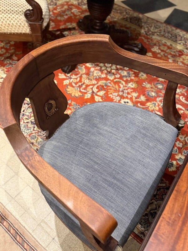 Ce fauteuil de bureau comporte à l'avant deux pieds gainés, à décors de bustes de cariatides, se terminant par des pieds griffe de lion et à l'arrière deux pieds sabre.