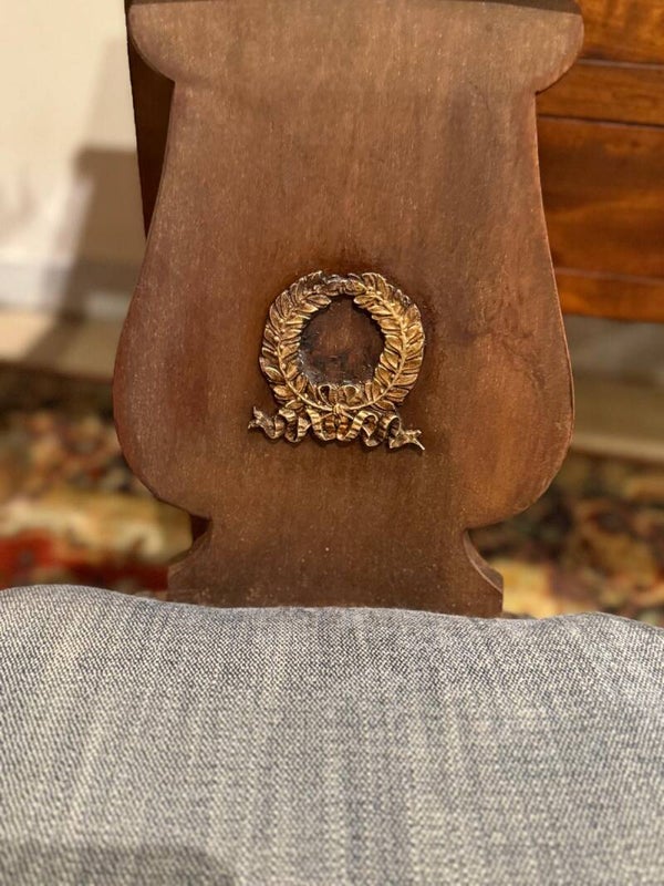 Un élément vertical reposant sur la ceinture arrière soutient la partie dosseret. Une rosace en bronze est appliquée sur sa façade.