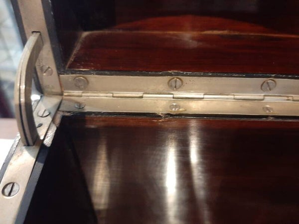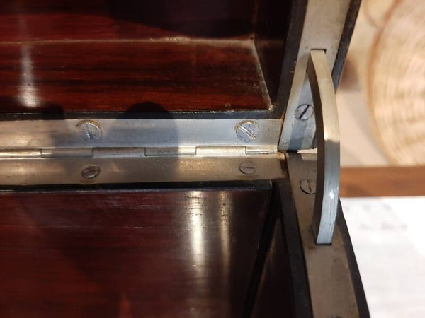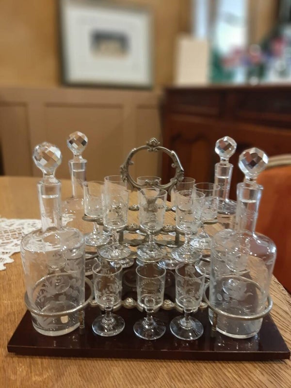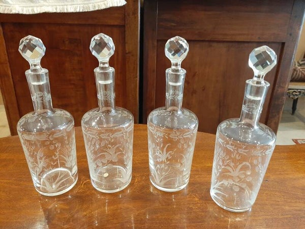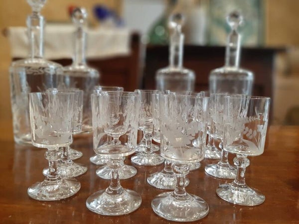 Signée Lassalle - 17 rue Caumartin - Paris D’une grande élégance, cette cave à liqueur en Palissandre et Nacre, comblera les amoureux d’objets raffinés. La façade et le dessus de ce coffret en Palissandre sont incrustés de cartouches à motif floral et feuilles d'Acanthe en ivoire. Le couvercle s’ouvre par une serrure d’origine en laiton à crochet avec deux fermoirs, accompagnée de sa clé en état de fonctionnement. A l’ouverture, nous découvrons un service complet en cristal Saint Louis composé de quatre carafes (bouchons et carafes numérotés) et seize verres à liqueur à motifs ciselés Saint Louis (un verre modèle différent).