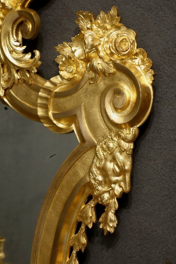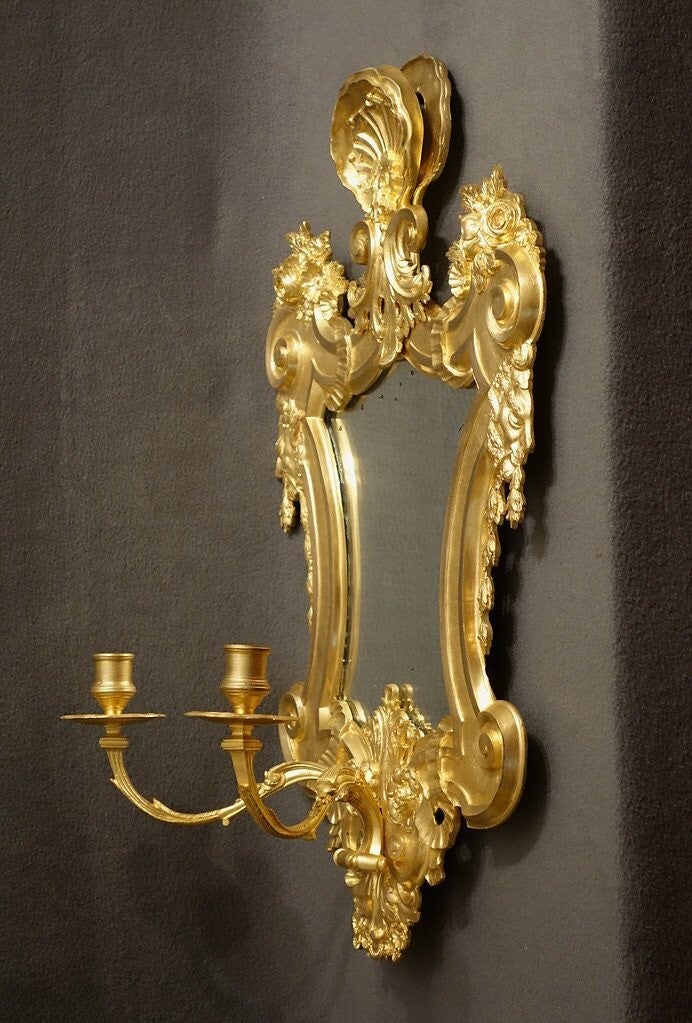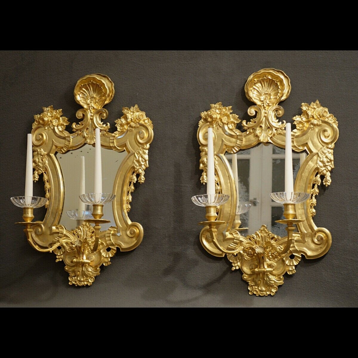 Cette paire de belles appliques est constituée d’un encadrement chantourné à volutes, des têtes de faunes en profil tiennent des feuillages entre leurs dents, le fronton se caractérise par une coquille et une deuxième auréole détachée donnant une impression de profondeur.